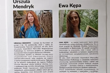 Gwiazdki w rzepakuAutorka: Urszula MendrykPrzędza: osnowa bawełna, wątek przędza mieszana, bieżnikWymiary: 48×120 cmTechnika: radziuszka