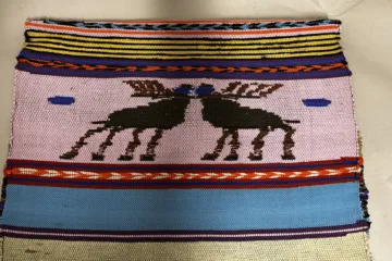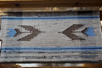 PołączoneAutorka: Urszula MendrykPrzędza: osnowa bawełna z wiskozą, wątek wełna merino i przędza mieszana, tkanina na ścianie (drzewa z gwiazdami)Wymiary: 39×53 cmTechnika: radziuszka