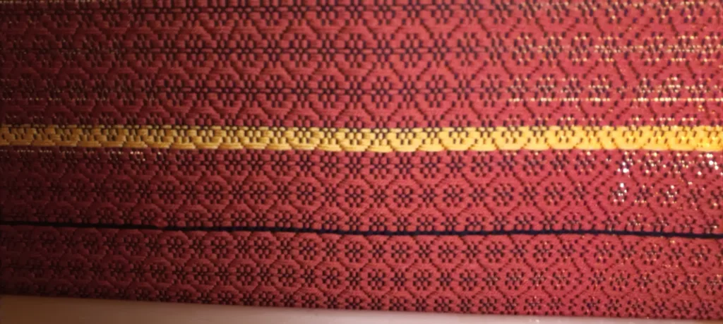 Przędza: osnowa czarna nić poliamid, wątek bawełna z akrylem w odcieniach żółty – koralowy