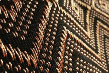 Bieżnik tkany jest metodą sejpak. Zastosowana przędza – czarna bawełna i złota nić ozdobna.