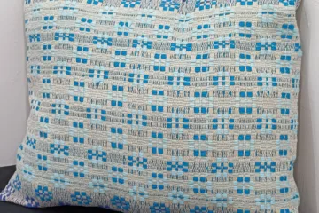 GwiazdozbiórAutorka: Aleksandra StaszakPrzędza: osnowa szara bawełna, wątek bawełniany w odcieniach niebieskiego, poduszkaWymiary: 45×45 cmTechnika: radziuszkaRok wytkania: 2024Inspiracja: motyw tkacki moda w gwiazdki