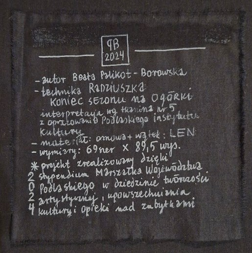 Do powstania obiektu Koniec sezonu na Ogórki zostały wykorzystane 2 sekwencje deptania z wzoru głównego/spisku – tkanina nr 5/W Ogórki, będący jego interpretacją.