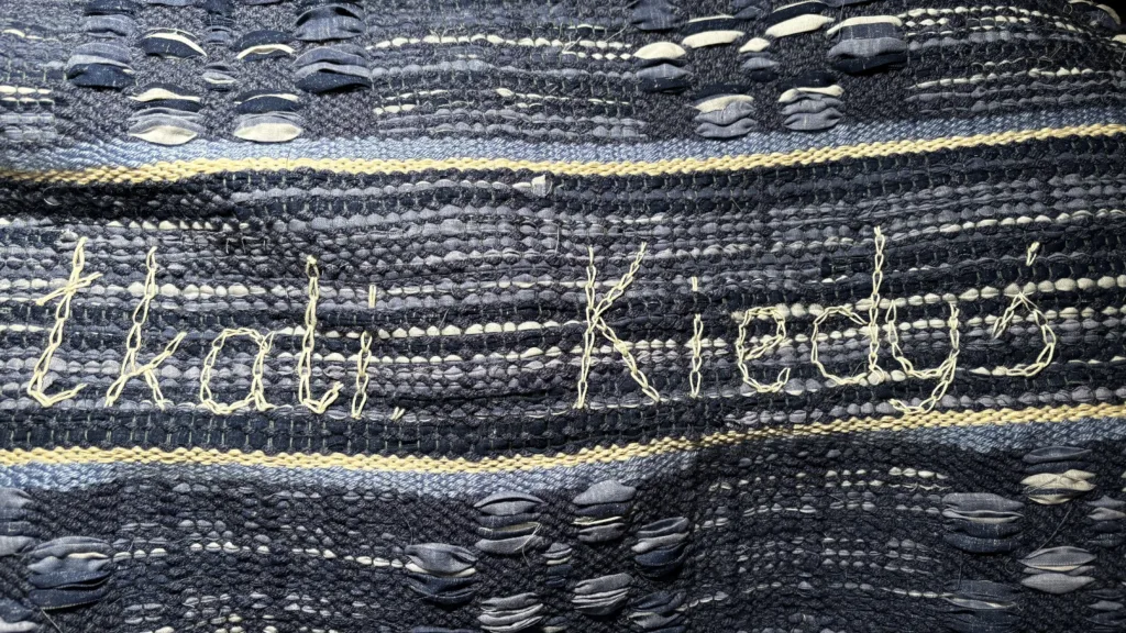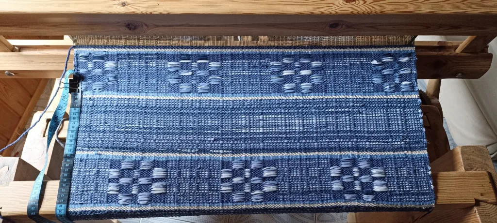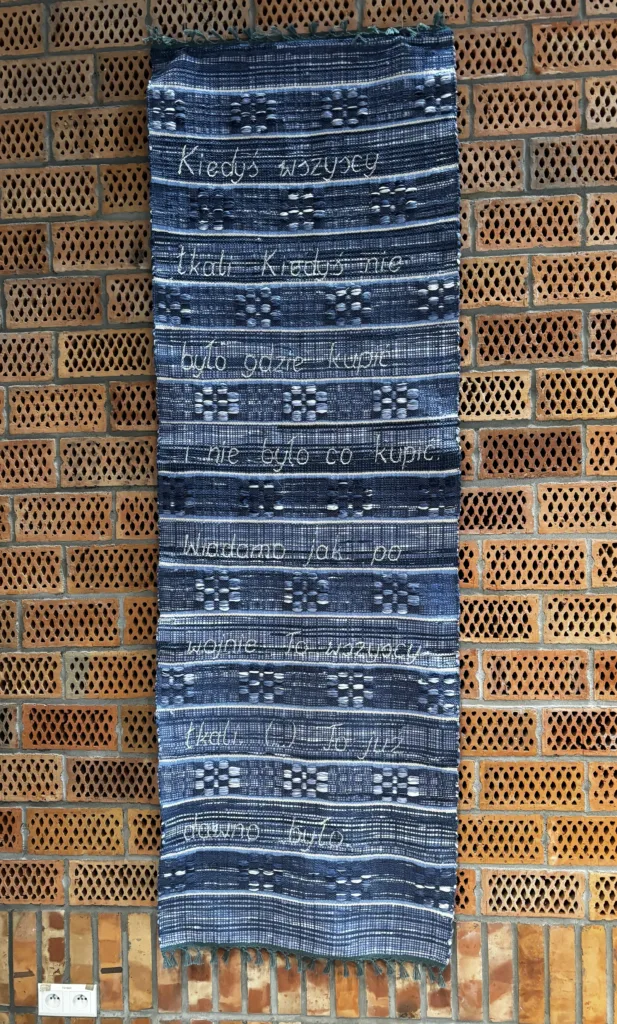 Chodnik „szmaciak” wykonany na kilkudziesięcioletnich chłopskich krosnach odnalezionych we wsi Pulsze. Linie wyznaczane przez rytmicznie układające się pasma wątku wypełniają słowa 92-letniej pani Anny mieszkającej we wsi Trześcianka, której opowieści o dawnym wiejskim tkactwie wysłuchałam w jej domu w kwietniu tego roku.