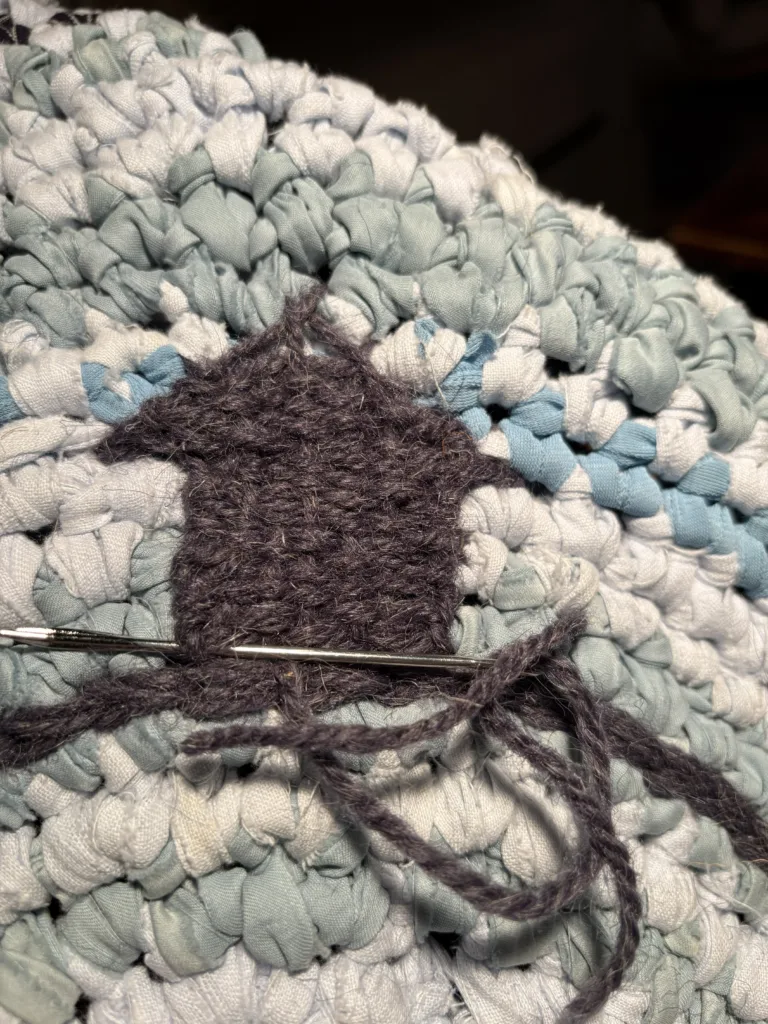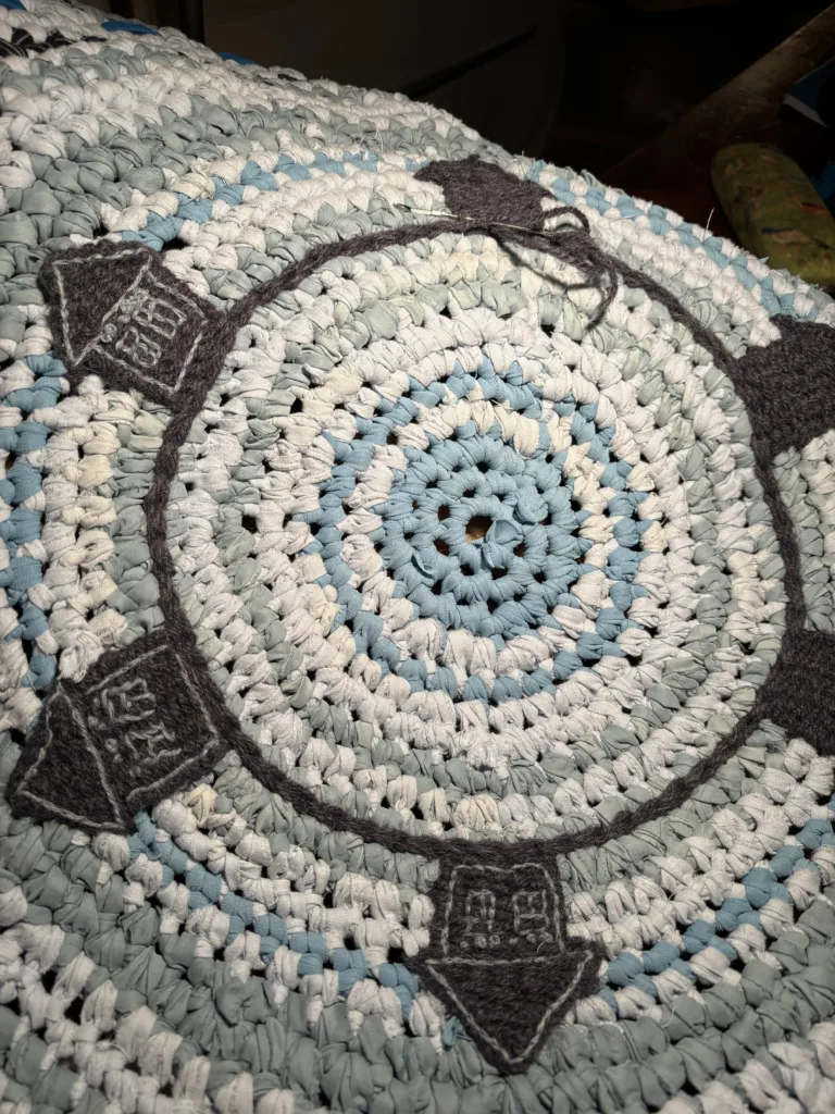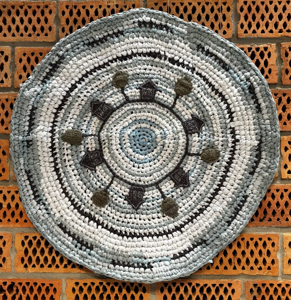 Chodnik „szmaciak” na planie koła wykonany na szydełku. Figura symbolizująca nieskończoność, wieczność, absolut i doskonałość stworzona ze szmatek, które przed kilkudziesięciu laty pocięły w paski i zwinięły w kłębki ręce tych, które/którzy nie zdążyli przywrócić im życia.