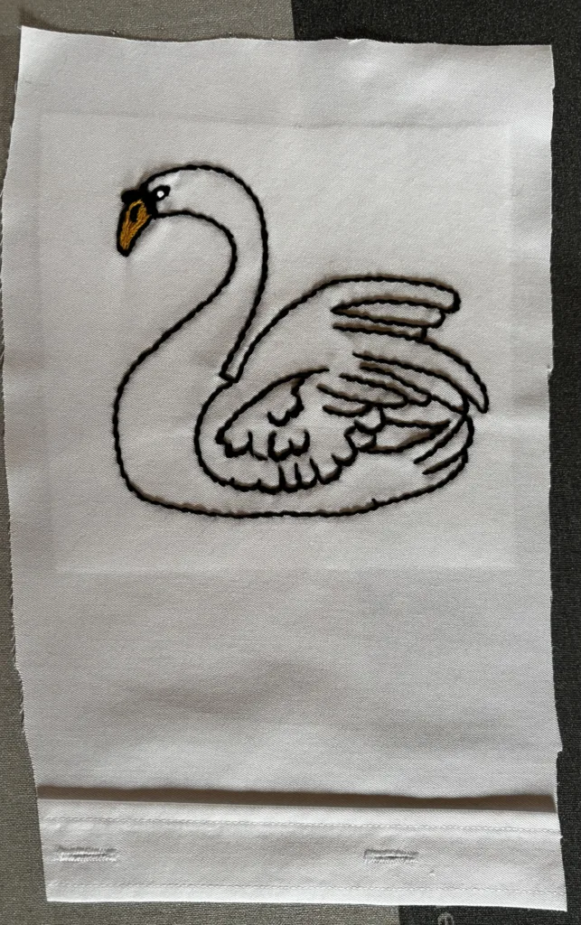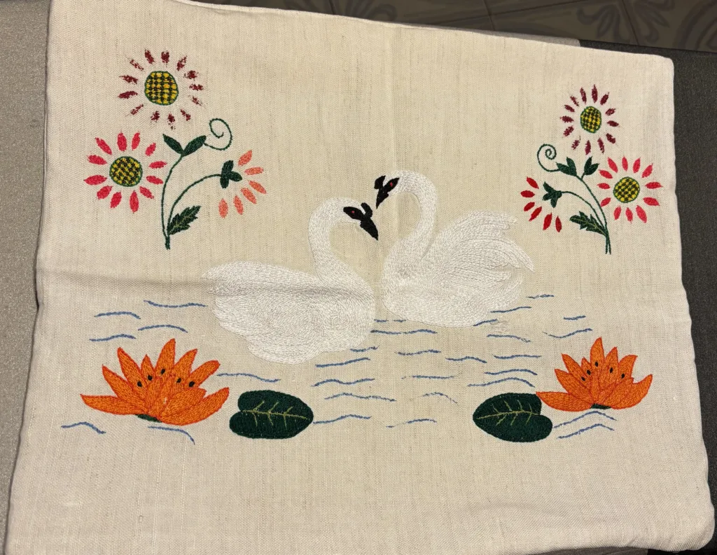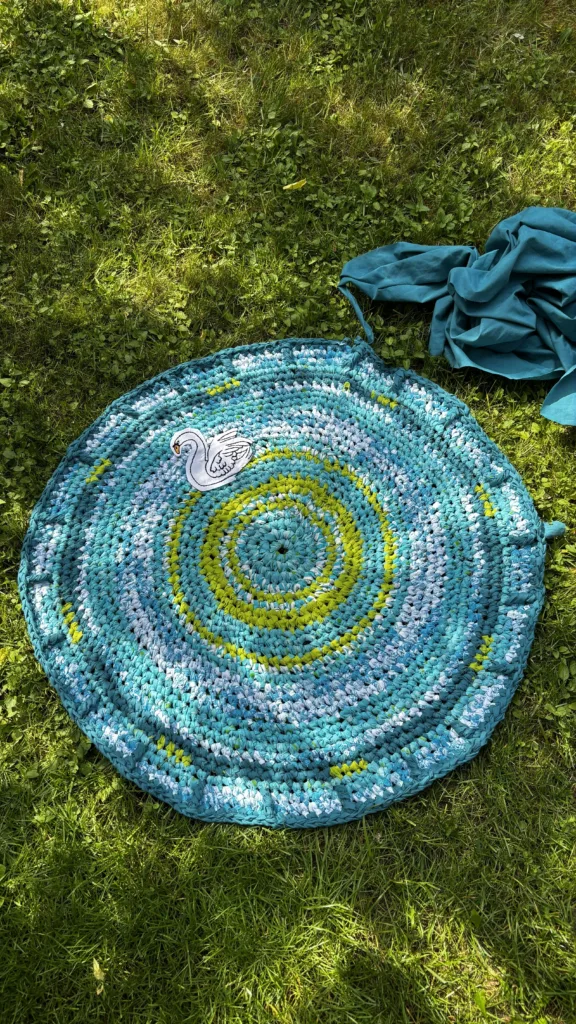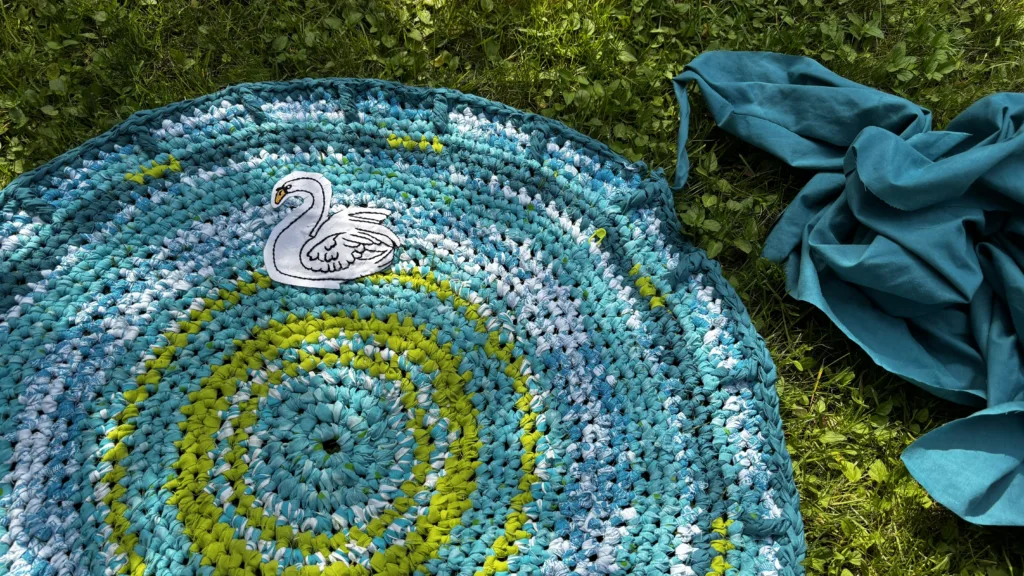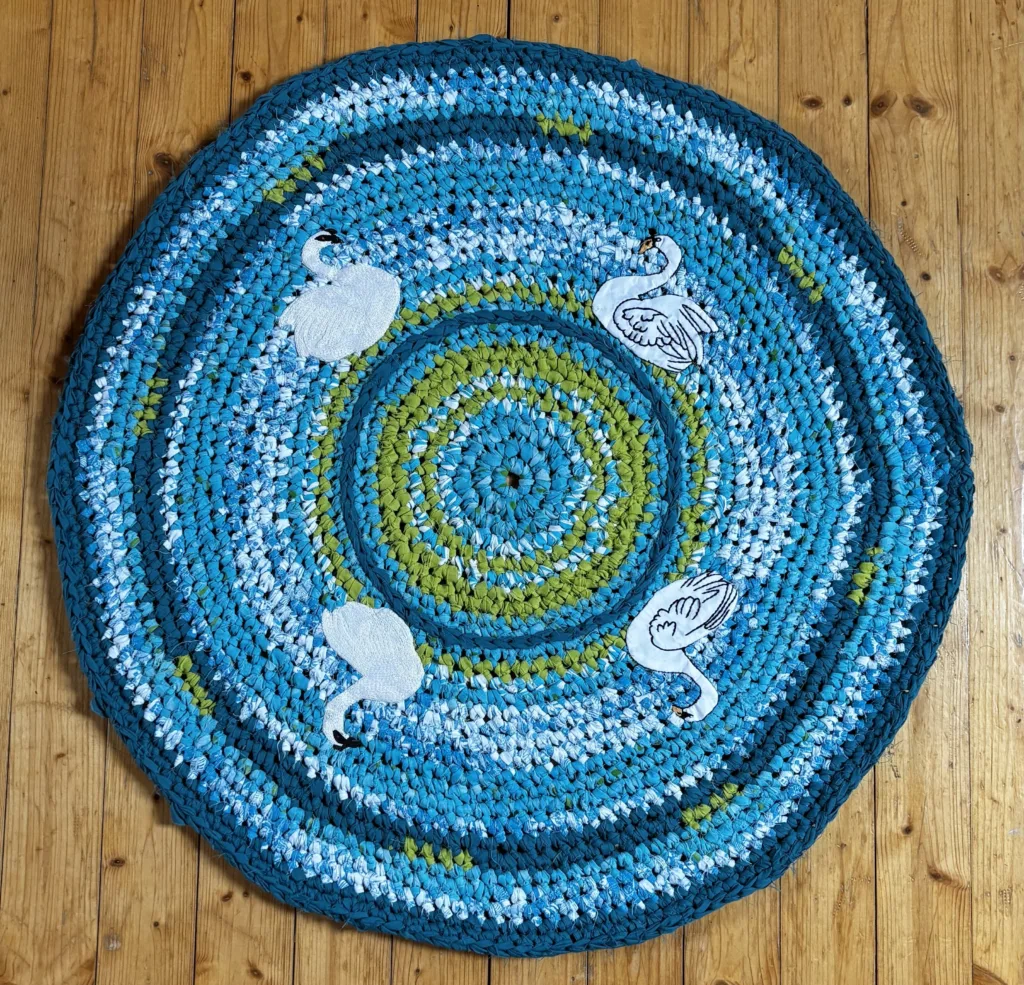 Chodnik „szmaciak” na planie koła wykonany na szydełku. Figura symbolizująca nieskończoność, wieczność, absolut i doskonałość stworzona ze starych i niepotrzebnych tkanin ozdobiona haftowaną aplikacją przedstawiającą łabędzie. Motyw tych ptaków w lokalnej twórczości ludowej pojawiał się często. Był spotykany na makatkach i obrzędowych ręcznikach. Para łabędzi skierowanych ku sobie symbolizowała miłość i wierność. Łabędzie „pływające” na turkusowej tkaninie stworzyłam „z” oraz „w oparciu” o zetlały „jasiek” wyhaftowany przed laty przez moją Babcię Walentynę. Dwa z ptaków to fragmenty wycięte z tej ozdobnej poszewki na poduszkę, zbyt zniszczonej, by jej używać. Kolejne dwa łabędzie wyhaftowałam i wycięłam z koszuli, która, choć nadal śnieżnobiała, stała się zbędna po odejściu jej właściciela z korporacji (ponieważ logo pracodawcy „zdobiło” jej kołnierzyk i mankiety). „Współczesne” łabędzie wykonałam korzystając ze wzoru skopiowanego z kruszącego się już papieru, na którym narysowała go moja Babcia. Choć obie haftowałyśmy kształty ptaków podążając tym samym śladem, nasze prace się różnią. Łabędzie wyszywane na lnianym płótnie są stonowane i pokryte patyną czasu. W przeciwieństwie do nich „korporacyjne” łabędzie są „beszczelnie” jaskrawe i rzucające się w oczy. W zależności od perspektywy, z której spoglądamy na mandalę, ptaki te zbliżają się do siebie lub oddalają. Dzieje się to w tym samym momencie.