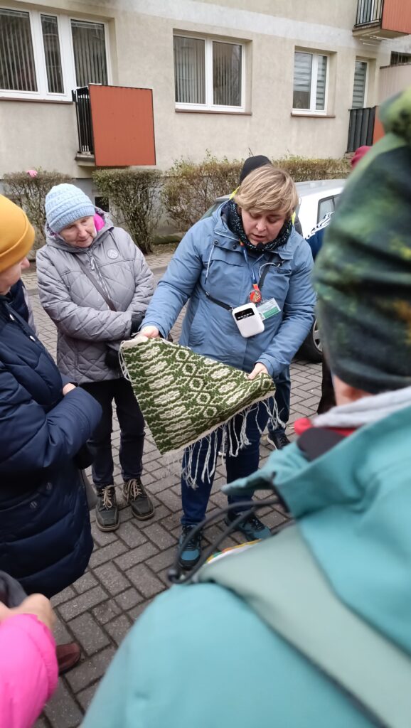 Rozpoznawaliśmy co produkowano i czym handlowano na przestrzeni dziejów m.in. suknem, wełną ponowna, jedwabiem i materiałem na kapelusze. Bezbłędnie uczestnicy wskazali czym jest wątek i osnowa. Wspólnie oglądaliśmy tkaniny tworzone na ręcznych krosnach, charakterystyczne dla województwa Podlaskiego. Tradycje tkackie na Podlasiu są wciąż żywe. Coraz więcej młodych osób w tym z grupy #tkaMy kultywuje tradycje tkackie i czerpie z nich tworząc nowoczesne tkaniny.