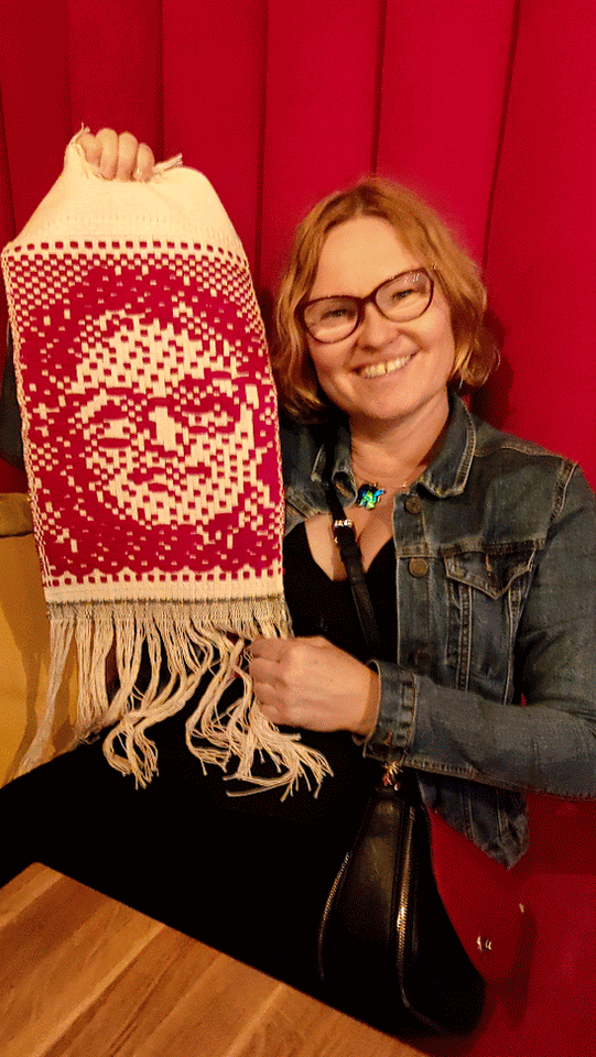 Razem w tym przypadku oznaczało wytkanie na jednym rodzaju osnowy, jedną techniką wspólnego dzieła. Kasia z Podlasia zaproponowała by wytkać nasze autoportrety techniką sejpaku. Beata Palikot-Borowska przygotowała na bazie zdjęć projekty. Tak od pomysłu do wykonania trwało to miesiąc. Sztafeta z krosnem była bardzo precyzyjna, kto kiedy i co tka. Każda z pięciu tkaczek sama dobierała wątek i decydowała o ostatecznym kształcie tkaniny. Jak to się skończyło? Możecie obejrzeć w naszej galerii oraz podczas wystawy w ramach IV Festiwalu Tkackiego SpoTkania organizowanego przez PIK w Białymstoku w 2023r.