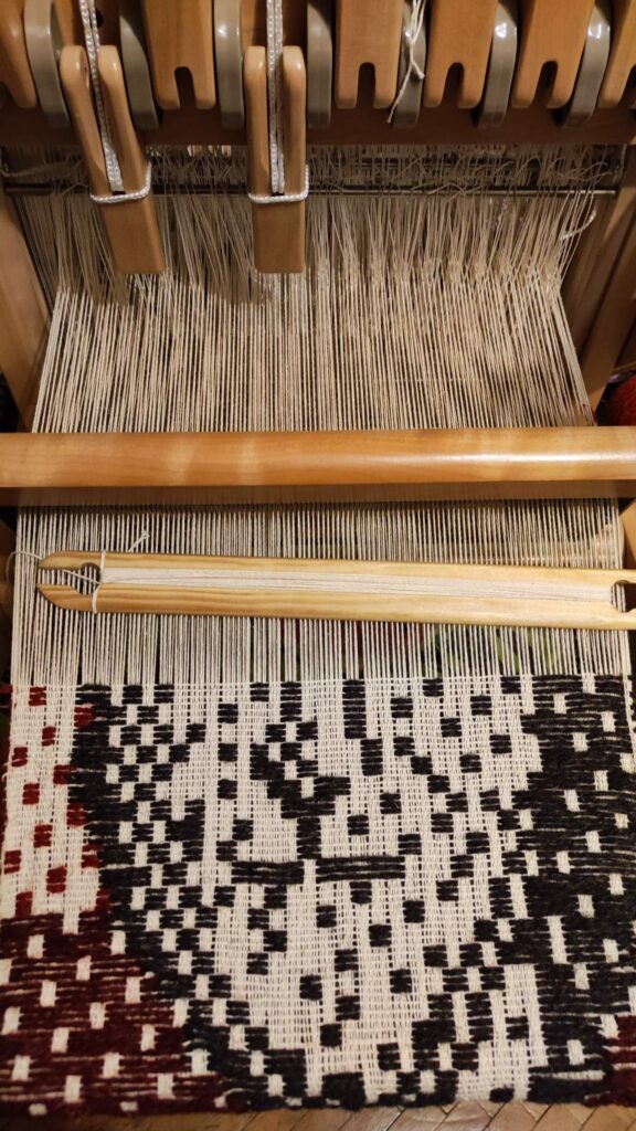 Razem w tym przypadku oznaczało wytkanie na jednym rodzaju osnowy, jedną techniką wspólnego dzieła. Kasia z Podlasia zaproponowała by wytkać nasze autoportrety techniką sejpaku. Beata Palikot-Borowska przygotowała na bazie zdjęć projekty. Tak od pomysłu do wykonania trwało to miesiąc. Sztafeta z krosnem była bardzo precyzyjna, kto kiedy i co tka. Każda z pięciu tkaczek sama dobierała wątek i decydowała o ostatecznym kształcie tkaniny. Jak to się skończyło? Możecie obejrzeć w naszej galerii oraz podczas wystawy w ramach IV Festiwalu Tkackiego SpoTkania organizowanego przez PIK w Białymstoku w 2023r.