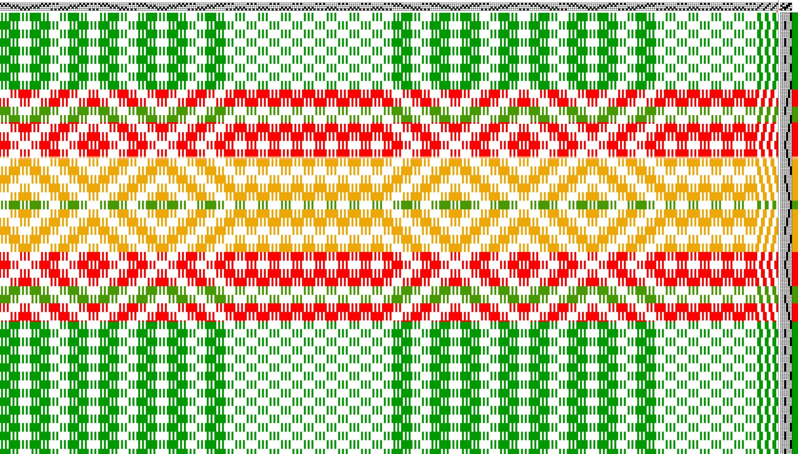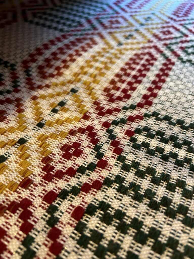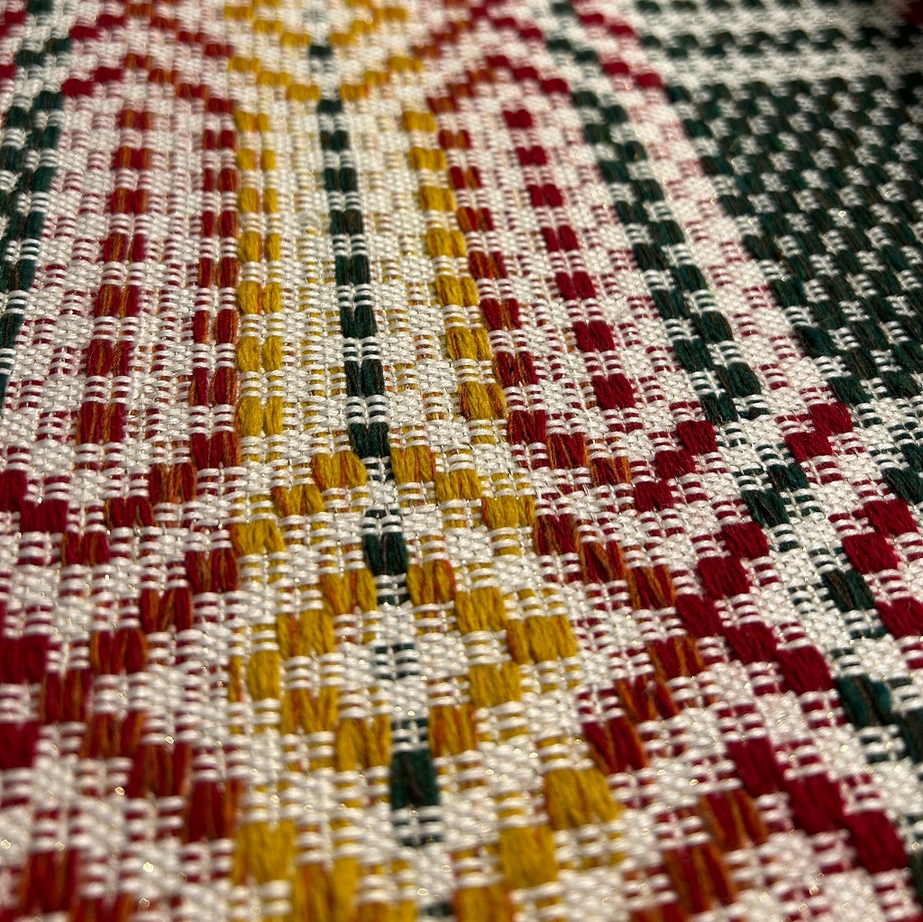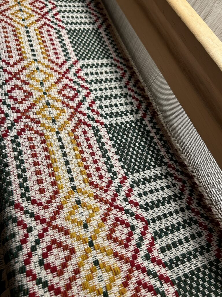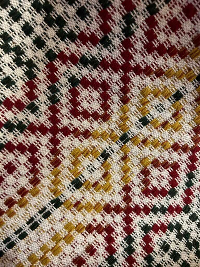 przędza: osnowa – biały len, wątek: wełna zielona, czerwona, żółta, gęstość osnowy 100nici / 10cm