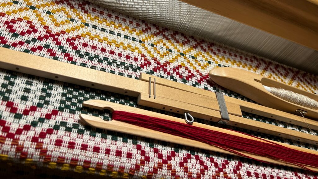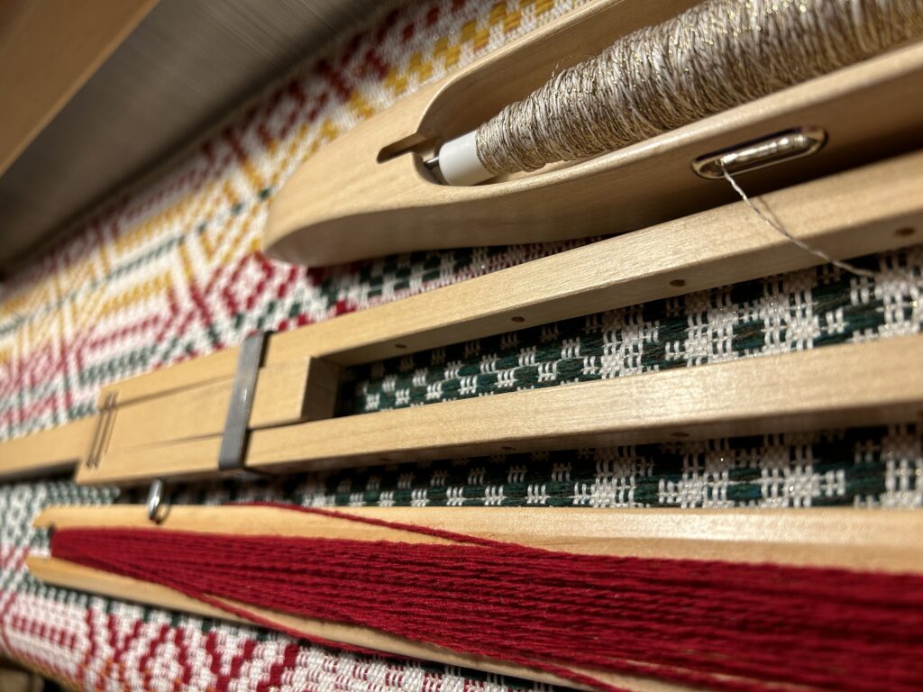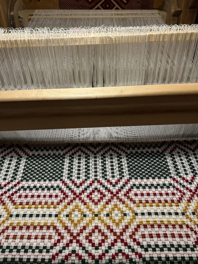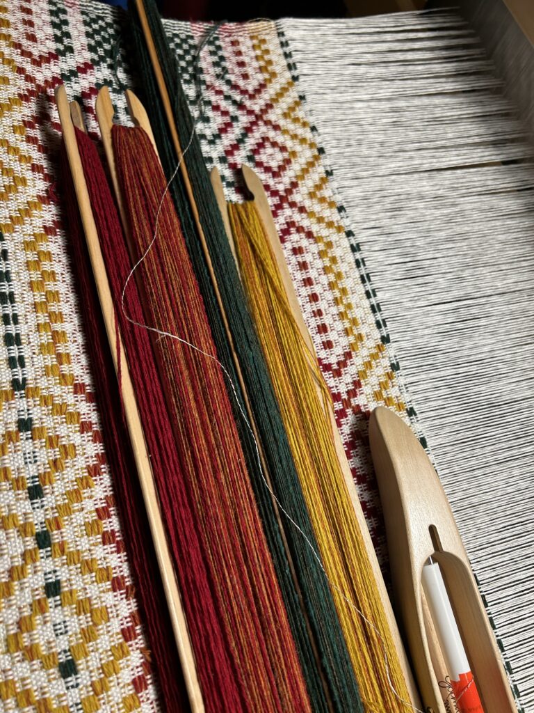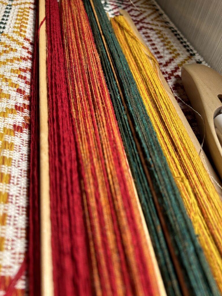 przędza: osnowa – biały len, wątek: wełna zielona, czerwona, żółta, gęstość osnowy 100nici / 10cm