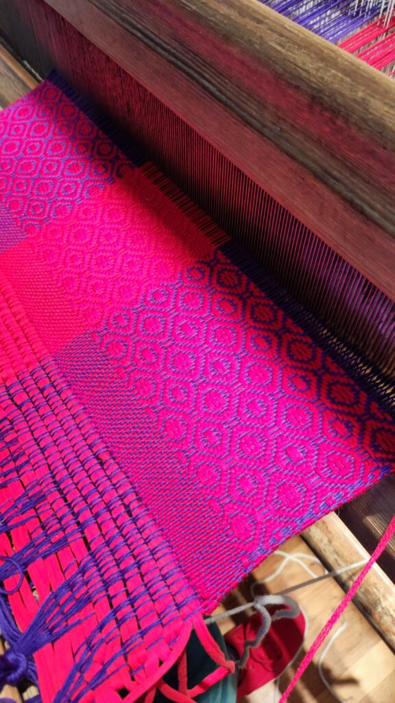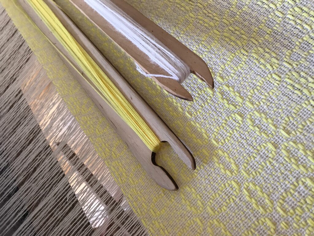 Gwiazdki w rzepakuAutorka: Urszula MendrykPrzędza: osnowa bawełna, wątek przędza mieszana, bieżnikWymiary: 48×120 cmTechnika: radziuszka