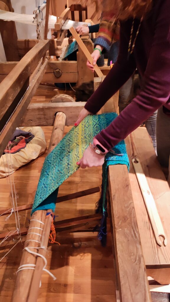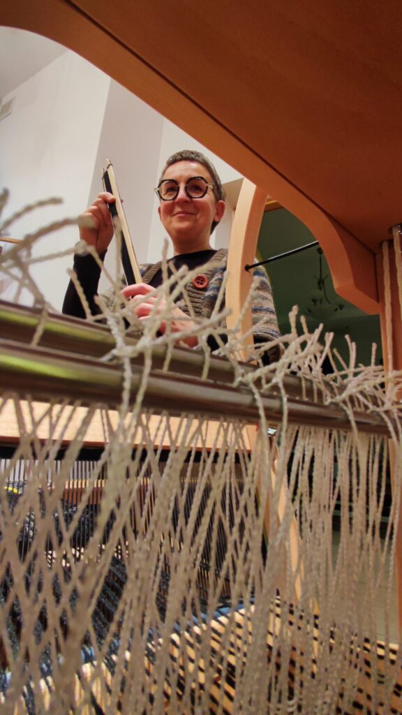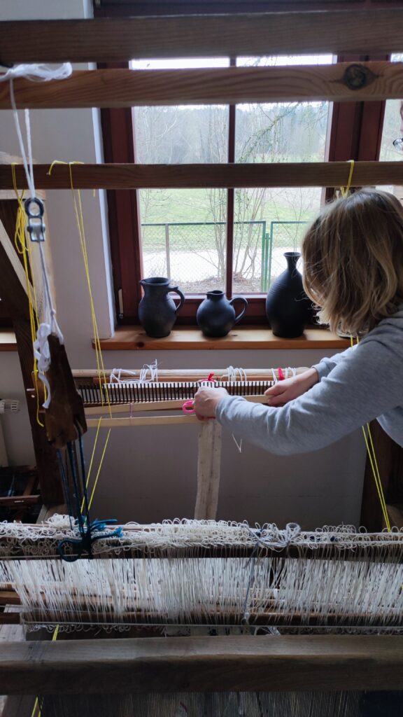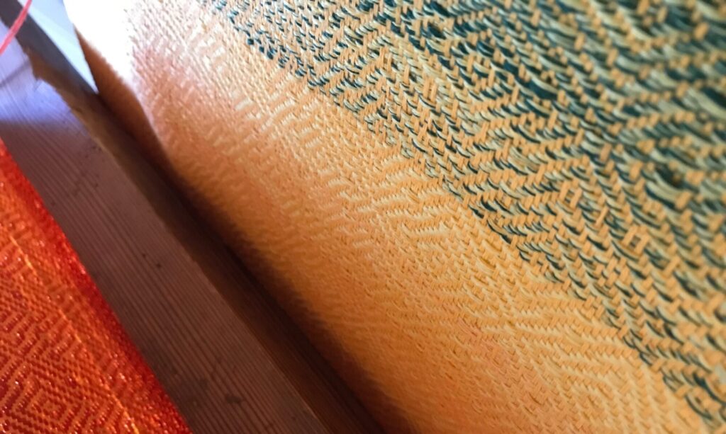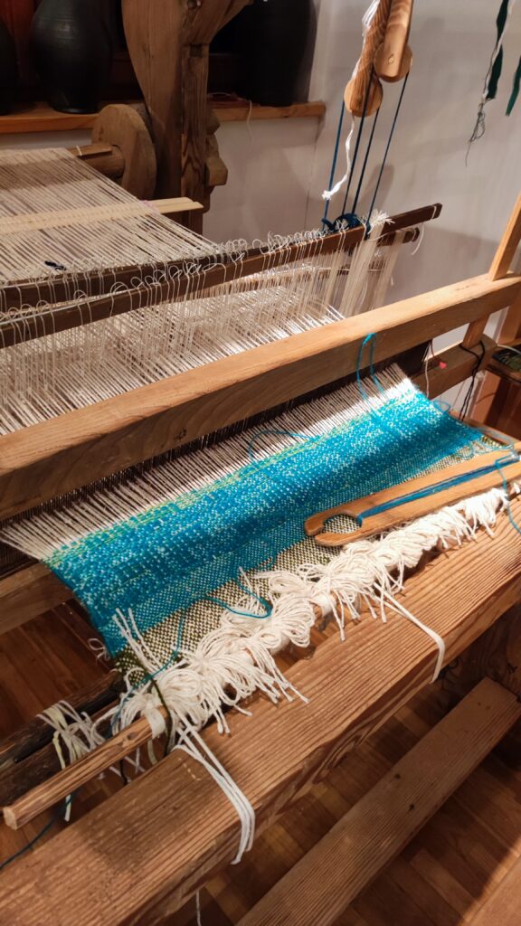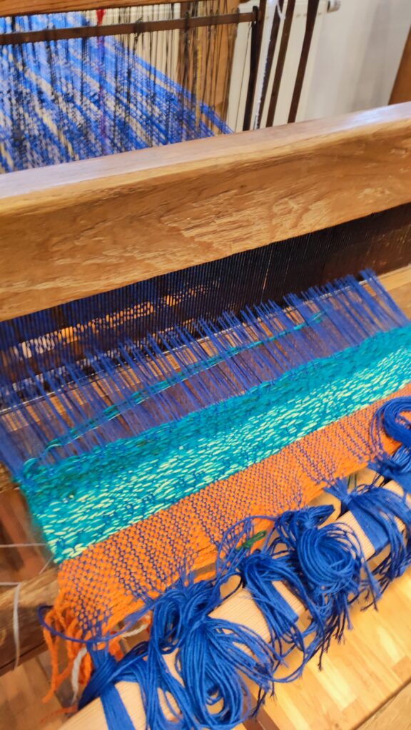 PołączoneAutorka: Urszula MendrykPrzędza: osnowa bawełna z wiskozą, wątek wełna merino i przędza mieszana, tkanina na ścianie (drzewa z gwiazdami)Wymiary: 39×53 cmTechnika: radziuszka