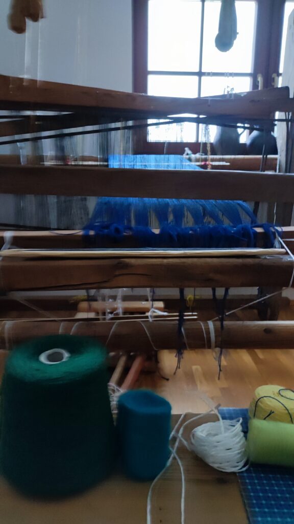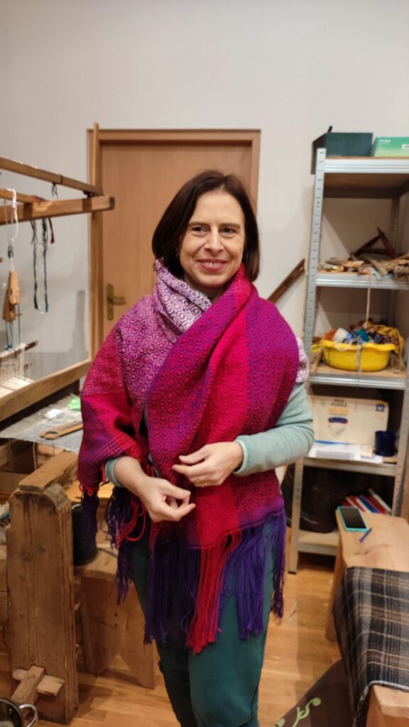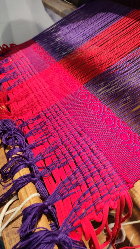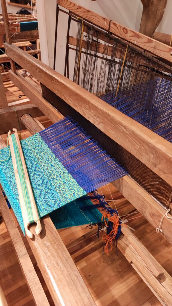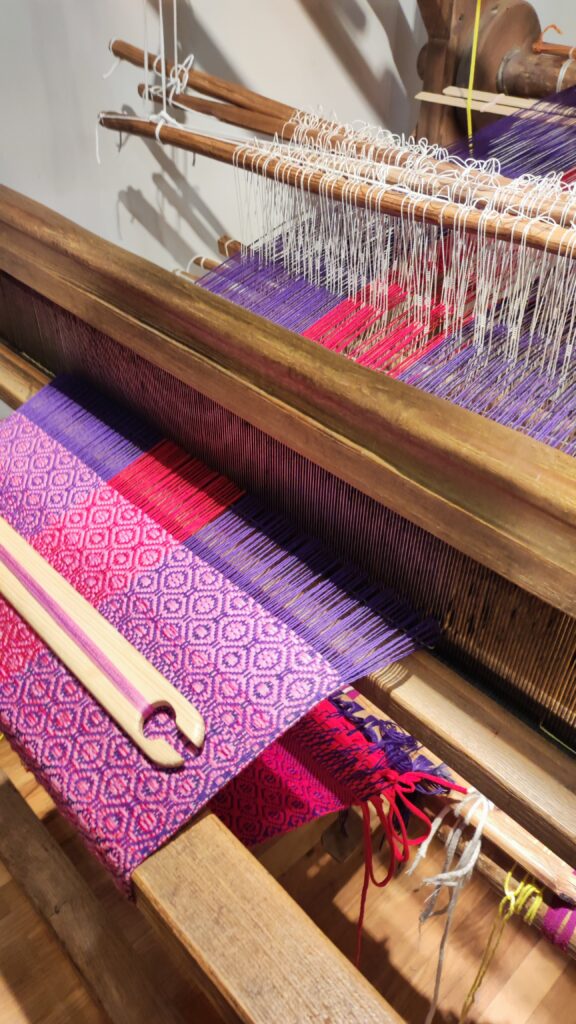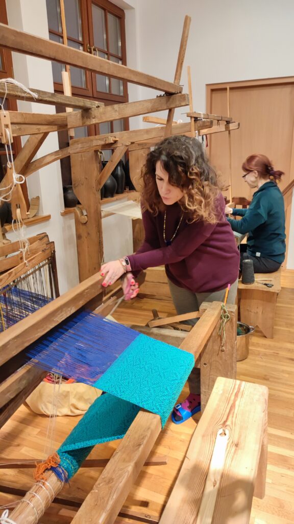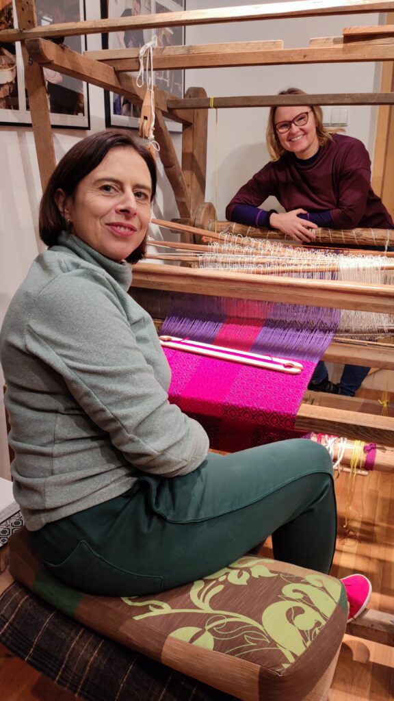 PołączoneAutorka: Urszula MendrykPrzędza: osnowa bawełna z wiskozą, wątek wełna merino i przędza mieszana, tkanina na ścianie (drzewa z gwiazdami)Wymiary: 39×53 cmTechnika: radziuszka