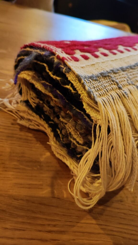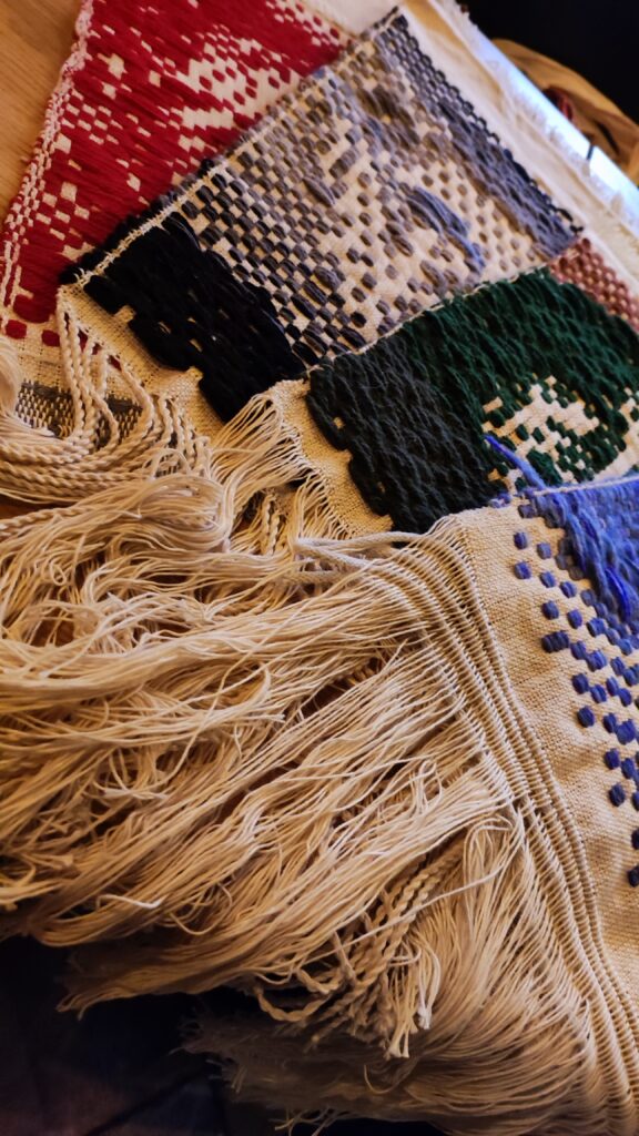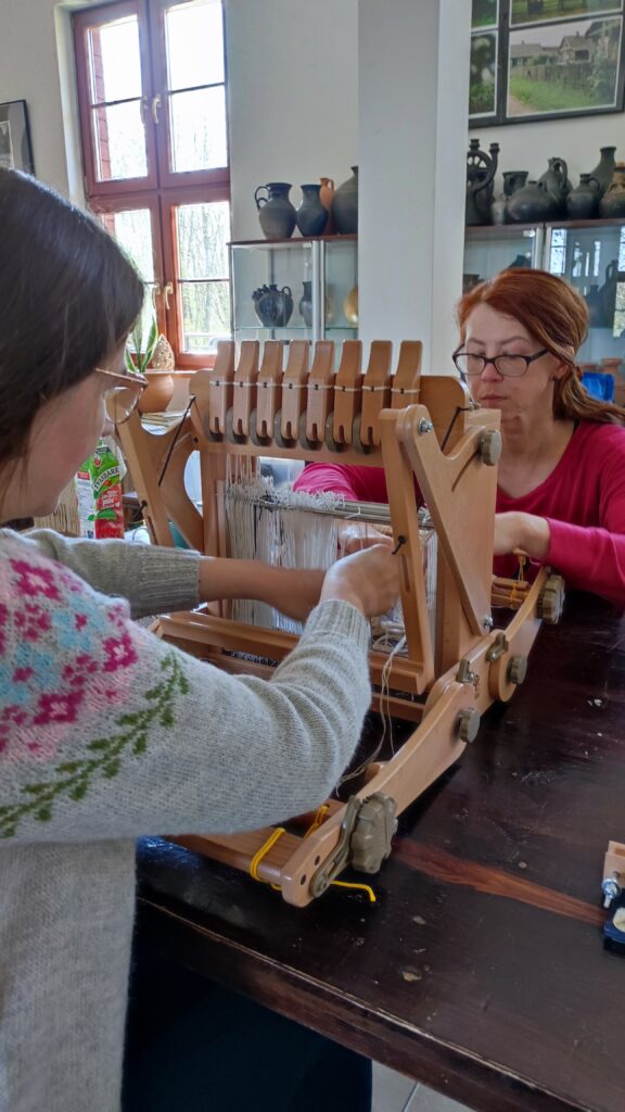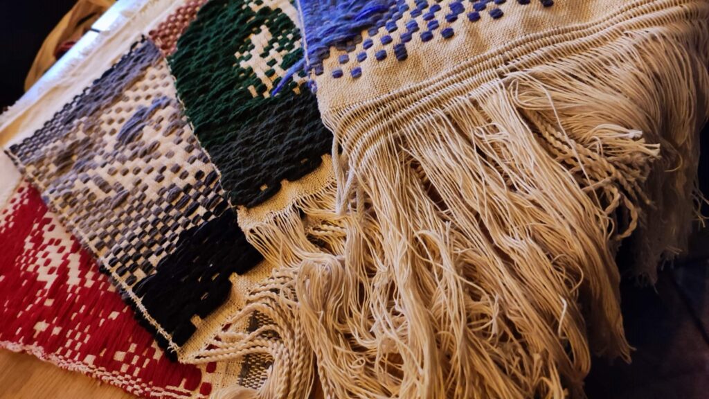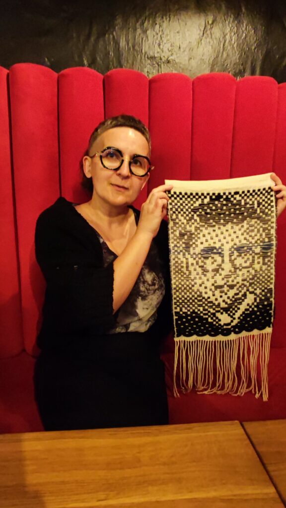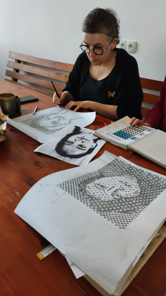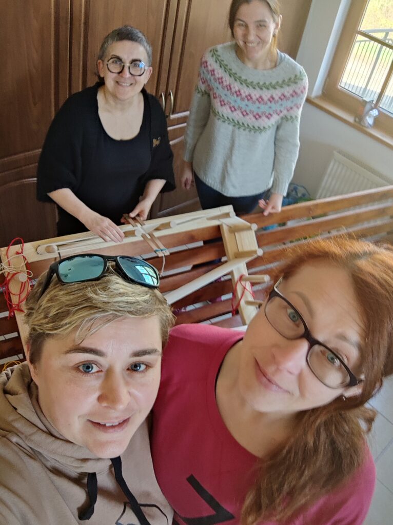 Razem w tym przypadku oznaczało wytkanie na jednym rodzaju osnowy, jedną techniką wspólnego dzieła. Kasia z Podlasia zaproponowała by wytkać nasze autoportrety techniką sejpaku. Beata Palikot-Borowska przygotowała na bazie zdjęć projekty i tak od pomysłu do wykonania zajęło nam to miesiąc. Sztafeta z krosnem była bardzo precyzyjna, kto kiedy i co tka. Każda z pięciu tkaczek sama dobierała wątek i decydowała o ostatecznym kształcie tkaniny. Jak to się skończyło? Możecie obejrzeć w naszej galerii oraz podczas wystawy w ramach Festiwalu organizowanego przez PIK w Białymstoku.